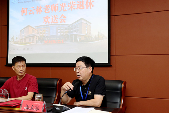 院長周立軍代表學院黨支部和學院致歡送辭,向光榮退休的何云林老師表示衷心的祝賀和親切的問候,對何云林為學院的建設和發展的辛勤付出表示感謝,并向其致以最真摯的祝福。