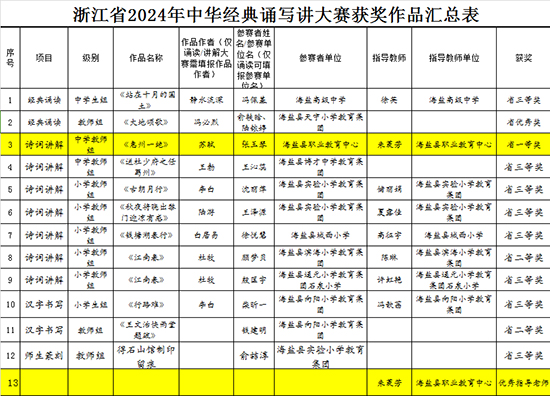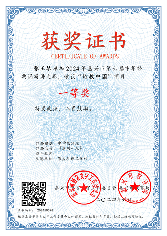 近日,由教育部、國(guó)家語(yǔ)委主辦的全國(guó)性賽事——2024年中華經(jīng)典誦寫(xiě)講系列活動(dòng)之“詩(shī)教中國(guó)”詩(shī)詞講解大賽(浙江賽區(qū))結(jié)果揭曉。海鹽職業(yè)教育中心語(yǔ)文組張玉琴老師在朱菱芳老師的指導(dǎo)下,榮獲此項(xiàng)賽事中學(xué)教師組省級(jí)一等獎(jiǎng),并以嘉興市唯一名額晉級(jí)國(guó)賽。