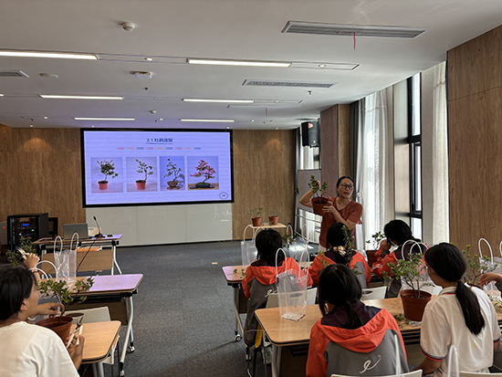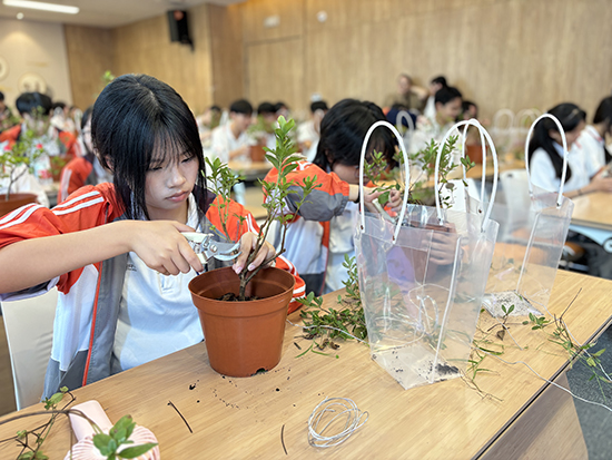 同學們走進碧云花園,跟著杜鵑花造型藝術非遺傳承人蔡海燕,學習設計杜鵑花造型。蔡老師講解并示范了杜鵑花造型技巧,從修剪到蟠扎,每一個步驟都充滿了匠心獨運。同學們專心致志聽講,紛紛動手實踐。