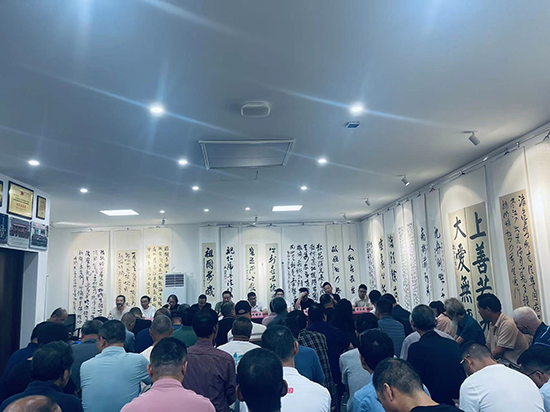 近200位來自諸暨市楓江書畫社、諸暨三賢研究會、諸暨市古越書畫院的社員和書法愛好者及親朋好友觀展,近距離欣賞魏仁虎的書法作品。四周墻壁上掛滿了大大小小尺幅、真草篆隸字體的100余幅多種形式的書法作品,條幅、楹聯、手卷、中堂、扇面、條屏等應有盡有,或娟秀的小楷,或恢宏的大字或流暢的行書,滿眼是雅致的書墨氣息,讓人沉浸在粗細筆畫、輕重筆力、疏密空間、濃淡墨味的書法海洋中,尤其是一樓西側擺放在桌子上的兩幅長卷,吸引眾位圍觀賞鑒,對魏仁虎一氣呵成、大氣磅礴、老到嫻熟地書寫贊美有加。