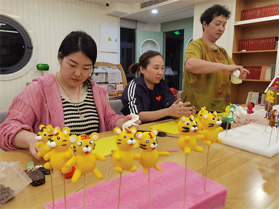 陳玉萍老師展示了自己事先做好的各種作品,豐富的色彩,逼真的形象,引來學員們的一致好評。大家都躍躍欲試,想創作一個屬于自己的作品。在陳玉萍老師的指導下,學員們開始捏“老虎”造型。陳玉萍老師一邊示范分解動作,一邊指導學員制作:“老虎的頭和身體可以是一樣大的兩個球。老虎的耳朵用剪刀剪掉一點,方便粘上去。”一個學員感慨道:“同樣在老師的指導下制作老虎,每個人做的都不一樣。有的眼睛特別大,有的粗胳膊粗腿,有的小巧玲瓏。”在一片歡聲笑語中,學員們完成了自己的第一件作品“小老虎”。