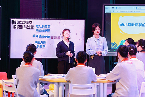 在“賽教融合課堂”觀摩環節,浙江省湖州藝術與設計學校的王云老師和企業導師曲海靜以雙師共導的形式開設了一堂《幼兒嘔吐癥狀的識別與處置》,寧海縣第一職業中學的胡虹燕老師則帶來了《幼兒常見意外傷害及其處理之異物入體傷害及處理》公開課。兩堂公開課亮點紛呈,教學方法兼具創新性與實用性。隨后,聽課教師就數字教學平臺和AI技術在教學的應用展開深入研討。