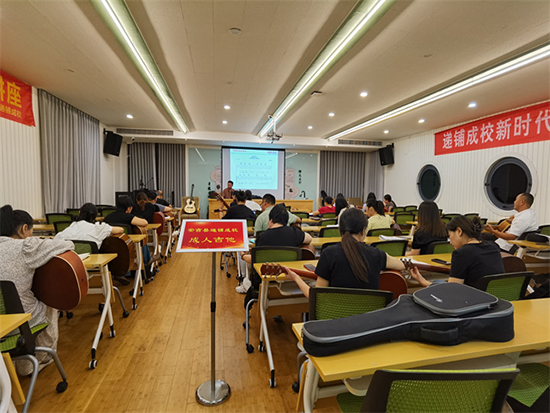 這是任剛老師為新時代市民夜校譜曲作詞的歌曲“夢想再啟航”,吉他班的學員們在任剛老師的指導下,一起演繹曲子,表達自己對新時代市民夜校的喜愛和感激之情。