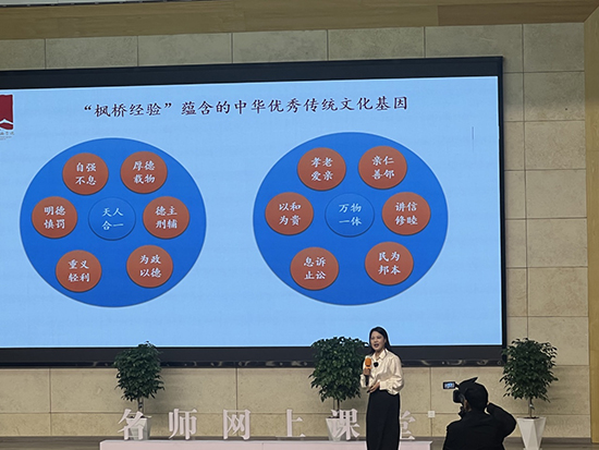 在連線環節,紹興市建功中學的學生詢問過去的“楓橋經驗”和新時代的“楓橋經驗”區別和變化是什么?馮國利解答:過去的“楓橋經驗”主要是為了改造四類分子,新時代的“楓橋經驗”則涉及黨建統領、三治結合、共建共享等。上虞外國語學校的學生問詢如何運用“楓橋經驗”處理、解決同學矛盾,馮國利給予了積極地引導。楓橋鎮初級中學的學生好奇于“楓橋經驗”為什么歷久彌新,馮國利從楓橋的文化底蘊和中華傳統文化的角度作解答。當學生提出“如何建設富有楓橋特色的校園文化”時,馮國利結合楓橋經驗“訴源治理”特點,提出了“合力營造共建共治共享的和諧校園氛圍”的出路。馮國利針對學生提出青春期親子關系問題,諄諄教誨,建議學生做好該做的事情,與父母多溝通,以理服人,營造良好的親子關系,安然度過青春期,成為更優秀的自己。