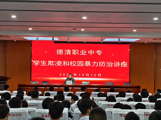 為提高學(xué)生們的法制觀念和自我保護意識,有效預(yù)防和減少校園欺凌事件的發(fā)生,10月16日下午,德清職業(yè)中專開展了“預(yù)防校園暴力 抵制校園欺凌”主題講座,學(xué)校高一年級300多名男生參加,講座由校黨委委員馬紀孝主持。