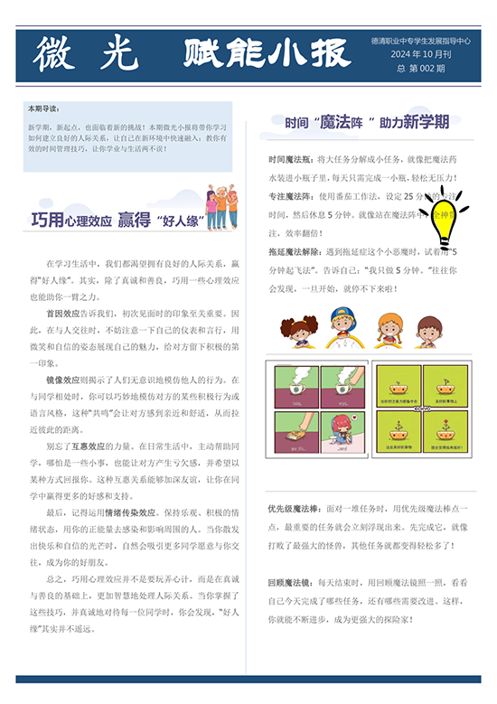 德清職業(yè)中專(zhuān)學(xué)生發(fā)展指導(dǎo)中心根據(jù)學(xué)生成長(zhǎng)需要,用心編輯“微光賦能小報(bào)”,用小報(bào)微光賦能學(xué)生健康成長(zhǎng),相信微光聚積亦能助力學(xué)生幸福人生。(崔明敏)