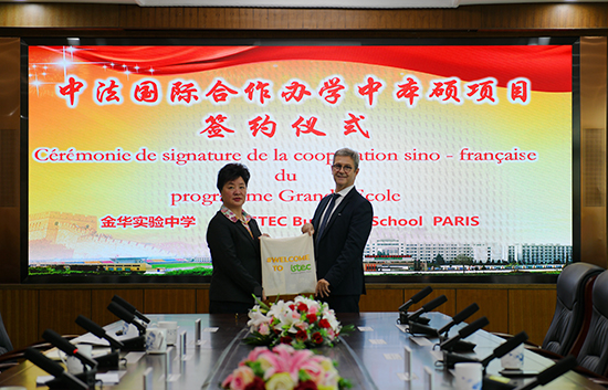 正值中法建交60周年暨中法文化旅游年之際,中法教育合作迎來了新的發展機遇。為深化國際教育交流,拓展學生的全球視野,10月24日下午,金華實驗中學與法國ISTEC高等商學院在精技樓會議室隆重舉行合作辦學簽約儀式。法國ISTEC高等商學院的Pierre Larrat教授和語言中心、法語預科項目負責人劉若靜女士跨越重洋、不遠千里而來,與金華實驗中學共同開啟中本碩項目的合作之旅。