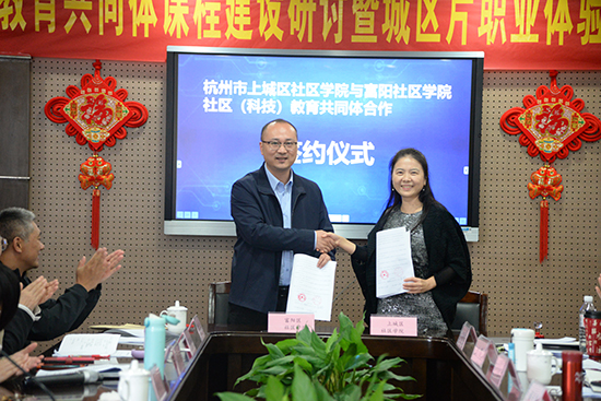 為積極響應(yīng)科教共同體共建共享、深化合作的初衷,在共同體成員的見證下,杭州市上城區(qū)社區(qū)學(xué)院院長項潔月與杭州市富陽區(qū)社區(qū)學(xué)院院長吳凌華共同簽署了《杭州市上城區(qū)社區(qū)學(xué)院與杭州市富陽區(qū)社區(qū)學(xué)院社區(qū)(科技)教育共同體合作協(xié)議》,結(jié)對推進(jìn)社區(qū)科技教育工作。
