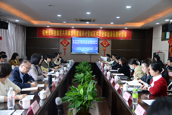 杭州市教育科學(xué)研究院林曉老師組織科教共同體聯(lián)盟成員單位就《杭州市科技教育共同體聯(lián)盟課程共建共享工作方案》進(jìn)行討論。杭州市科技教育共同體工作聯(lián)絡(luò)員對共同體聯(lián)盟課程組建、課程選課辦法以及課程送教辦法各抒己見,建言獻(xiàn)策。