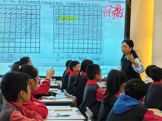 小學數學專場,長興縣教育研究中心楊明嵐老師執教《認識百分數》,她基于統計視角,發展數據意識,聚焦分數、小數、比和百分數的共性啟發學生思考;寧波市鄞州區宋詔橋小學呂峰老師執教《平均數》,注重真實情境,引發沖突,引領學生深度思考;寧波市鄞州區惠風書院侯燕妍老師執教《百分數》,她從生活情境入手,追尋本質,凸顯數據意識,彰顯數據價值。正高級教師、浙江省特級教師邵愛珠對三節課進行點評,圍繞課標內容、統計與概率在教材內容的變化思考、統計教學的建議三個方面為老師們作了《小學數學統計與概率教學思考》的專題講座,啟發教師對小學數學統計與概率領域上的思考,樹立數據的意識,探尋數據價值。