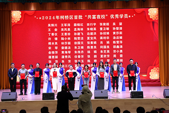 胡李川宣讀《關于表彰2024年柯橋區“學習之星”“書香家庭”“學習型社團”“學習型社區”“學習型企業”的決定》和《關于表彰2024年柯橋區首批“共富夜校”優秀學員的決定》,20名“學習之星”、20戶“書香家庭”、16個“學習型社團”、16個“學習型社區”、19家“學習型企業”和59名“共富夜校”優秀學員受到表彰。