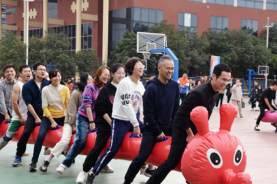 此次趣味運動會設有乒乓球擲準、投飛鏢、套圈、立定跳遠、1分鐘夾彈珠等個人項目,以及心心相應(背夾球接力賽)、拔河、快樂毛毛蟲等集體項目,既有趣味性又有挑戰性,既有益智性又有健身性,既要發揮個人實力又考驗團隊配合。特別是集體項目比賽中,教職工分為5個學院展開爭奪,各參賽隊伍積極組織,配合默契,場上奮勇爭先,場下歡呼鼓勁,賽場上吶喊聲、歡笑聲交織成一片。