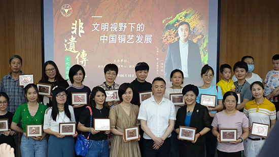 “朱炳仁·銅”終身學習品牌項目致力于非遺文化的傳播和傳承。加入了杭州“薪火傳承——工藝美術大師帶徒弟學藝”活動中,并取得明顯成效,出師的學生都能獨當一面,成為了工藝美術事業中的一份子,也為企業創造了不少功績。之后的“薪火傳承計劃”中不僅保留了工美大師帶徒授藝,順應“互聯網+”“文化+”的融合發展趨勢,吸引了多家線上藝術品推廣平臺的參加,一大批活躍在互聯網上的“新匠人”群體,將由大師們授藝,使傳統工藝傳承保護與新產業、新消費緊密結合,讓更多的良品美器走進老百姓的美好生活。
