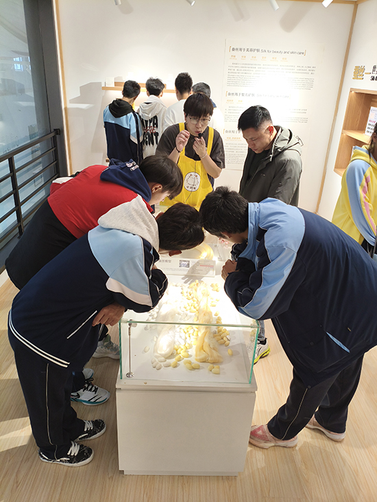 隨后來到海寧市中小學研學實踐中心。在小云龍蠶桑樂園基地輔導員老師的帶領下,同學們走進規模化蠶?;氐默F代化蠶房,親身體驗數字化養蠶的魅力。在500畝桑樹園內,同學們細心挑選采摘桑葉,為蠶寶寶準備最為鮮嫩的口糧。