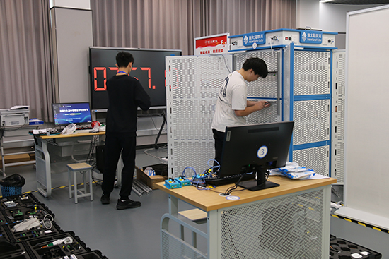 在比賽現(xiàn)場,陳逸浩、吳昀凱兩位同學(xué)更是展現(xiàn)出了過硬的心理素質(zhì)和扎實的專業(yè)功底。他們?nèi)褙炞⒌貞?yīng)對賽項中的每一個環(huán)節(jié),無論是復(fù)雜的設(shè)備安裝調(diào)試,還是棘手的應(yīng)用場景搭建,都能有條不紊地完成,精準地解決了一個又一個難題,將平日里訓(xùn)練的成果完美地呈現(xiàn)在評委面前。