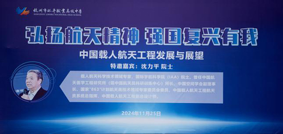 為深入學(xué)習(xí)航天精神,激發(fā)學(xué)生的愛國情懷,筑牢責(zé)任擔(dān)當(dāng),并啟迪學(xué)生的創(chuàng)新思維,凝聚團(tuán)結(jié)協(xié)作向心力,以航天逐夢(mèng)征程砥礪奮進(jìn)之志,11月25日下午,杭州市臨平職業(yè)高級(jí)中學(xué)特邀載人航天科學(xué)技術(shù)領(lǐng)域?qū)<摇H宇航科學(xué)院(IAA)院士沈力平來校,為同學(xué)們開設(shè)了一場(chǎng)主題為“中國載人航天工程發(fā)展與展望”的精彩講座。本次講座采用線上+線下方式進(jìn)行,各班教室設(shè)分會(huì)場(chǎng),學(xué)生在任課教師組織下認(rèn)真觀看直播。
