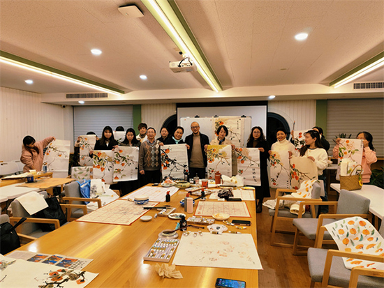 當(dāng)下正是柿子掛滿枝頭的季節(jié),紅紅的柿子像一盞盞小燈籠,與藍(lán)天白云相輝映。學(xué)員們希望學(xué)著畫下這樣的美景,于是,周捷老師決定當(dāng)天教大家畫“柿柿如意”。