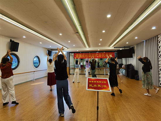 當(dāng)天,民族舞2班的學(xué)員們?cè)谂撕缋蠋煹膸ьI(lǐng)下,用新學(xué)會(huì)的舞蹈《那拉提的養(yǎng)蜂女》獻(xiàn)禮祖國(guó)母親的生日。