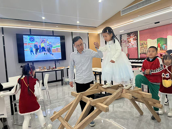活動現場,熱鬧非凡。在非遺教學館,“工匠魯班大師,探索歷史文化”親子活動的專業指導老師向家長和孩子們介紹了榫卯結構的歷史起源和在家具、建筑中的應用。隨后,參與者通過實物認知、實驗操作等環節,深入了解了榫卯結構的原理和制作技巧。在動手操作環節,大家親自嘗試制作榫卯魯班凳,感受傳統木工技藝的魅力和匠心獨運。
