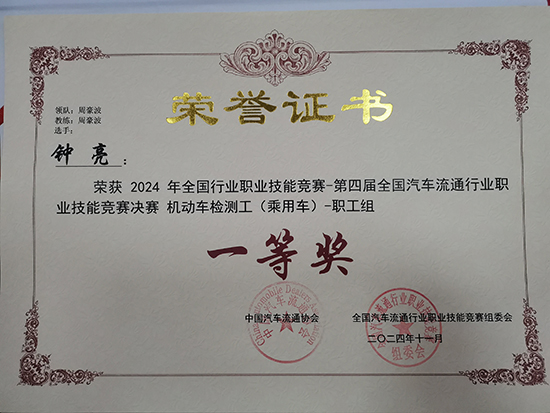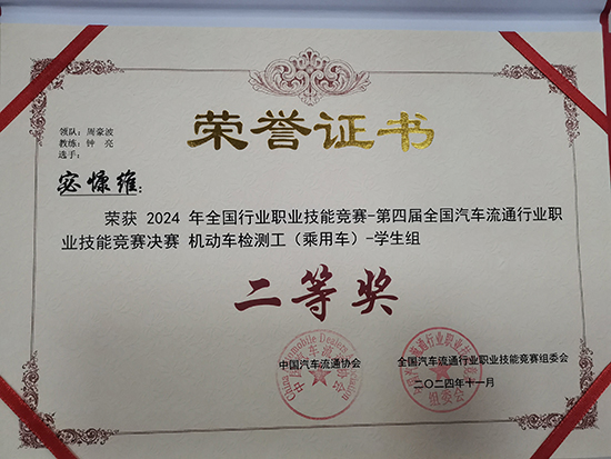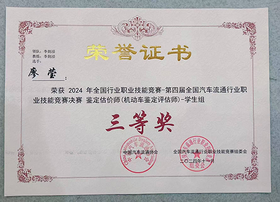 在鑒定評估師(機動車鑒定評估師)總決賽中,由周豪波老師指導的22汽修班童潔同學榮獲全國二等獎;由李剡涢老師指導的23汽車營銷班廖瑩同學榮獲全國三等獎。
