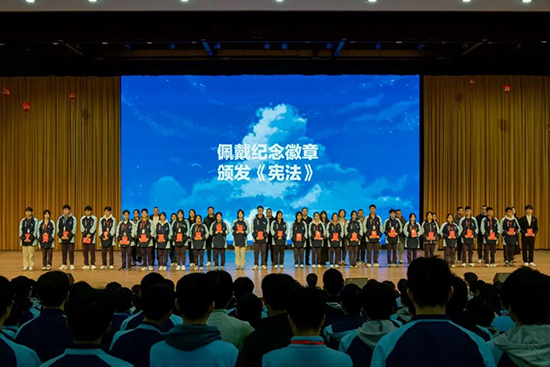 作為學(xué)校成人禮的必要環(huán)節(jié),在場(chǎng)的老師和家長(zhǎng)代表為學(xué)生代表發(fā)放《中華人民共和國(guó)憲法》并佩戴上了紀(jì)念徽章。全場(chǎng)同學(xué)握舉右拳,在學(xué)生會(huì)主席機(jī)電224班項(xiàng)云龍同學(xué)的帶領(lǐng)下,許下了堅(jiān)定的成年誓言。(浙江信息工程學(xué)校)