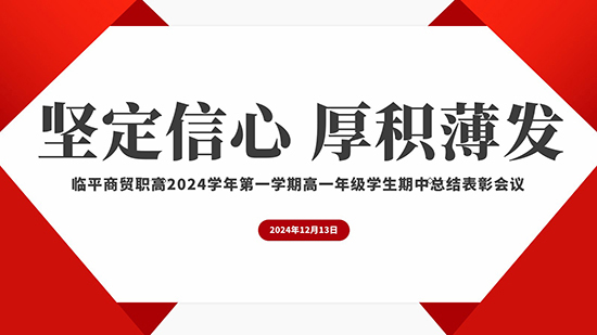 本次期中總結表彰會議,不僅是對過去半學期的深情回顧與總結,更是對未來的美好展望與有力動員。讓我們全體高一師生凝心聚力,以堅定的信念和不懈的努力,在臨平商貿職高這片教育的沃土里,播撒希望的種子,收獲成長的喜悅,向著更加燦爛的明天奮勇前行?。ㄅR平商貿職業高級中學)