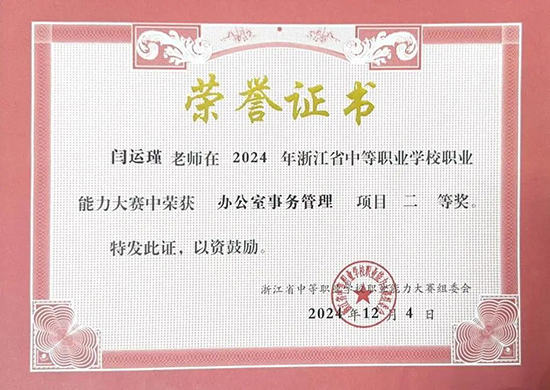 近日,浙江省中等職業(yè)學(xué)校職業(yè)能力大賽(教師技能類)“辦公室事務(wù)管理”項(xiàng)目比賽在浙江經(jīng)貿(mào)職業(yè)技術(shù)學(xué)院(杭州)圓滿落下帷幕。臨平商貿(mào)職高商務(wù)助理專業(yè)閆運(yùn)瑾老師與來自省內(nèi)10個(gè)市17所職校的參賽教師們同臺(tái)角逐,最終獲得二等獎(jiǎng)!
