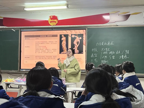 第二節課項盼盼老師帶來了《外國雕塑:力與美的追求》一課。她以古希臘時期雕塑為切入點,通過課堂討論法、小組討論、模仿展示和探索實踐等一系列探究活動,引導學生們深入探究古希臘雕塑成為西方理想典范的原因。在項老師的悉心指導下,學生們不僅領略到了古希臘雕塑莊重的藝術品格和理想化的風格追求,還通過探討“維納斯的殘缺與完整美”這一主題,進一步提升了藝術感知能力和鑒賞能力。項老師以其獨特的親和力和教學風格,為課堂氛圍注入了無限活力。