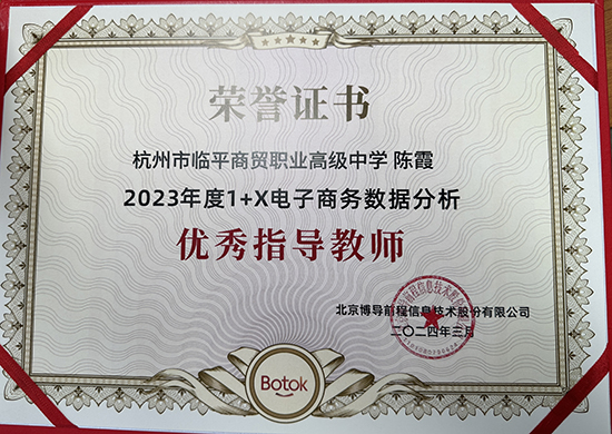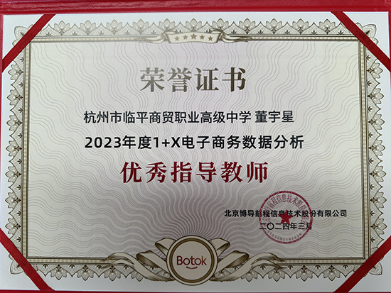 2024年度,杭州市臨平商貿職業高級中學在“1+X”證書制度試點工作中取得了驕人成績,榮獲“1+X”電子商務數據分析職業技能等級證書2023年度“優秀考核院校”“1+X”業財一體信息化應用職業技能等級證書2023年度“優秀院校”“1+X”文創產品數字化設計職業技能等級證書2023年度“優秀組織院校”,并有陳霞、董宇星兩位老師被評為2023年度“1+X”電子商務數據分析“優秀指導教師”。