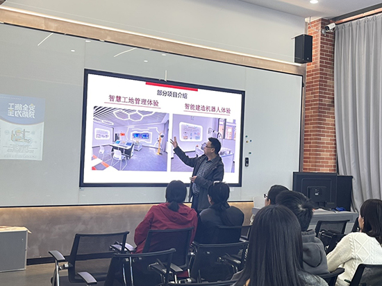 智能建造系主任柯建向來訪者詳細介紹了學校建筑安全體驗中心和智能建造實訓中心的基本情況及其主要功能。他指導師生們進行可視化、沉浸式的安全項目體驗,并深入探討了3D打印技術在建筑領域的應用。通過智能建造機器人和智慧工地管理系統的展示,師生們親身體驗到了智能建造的魅力。