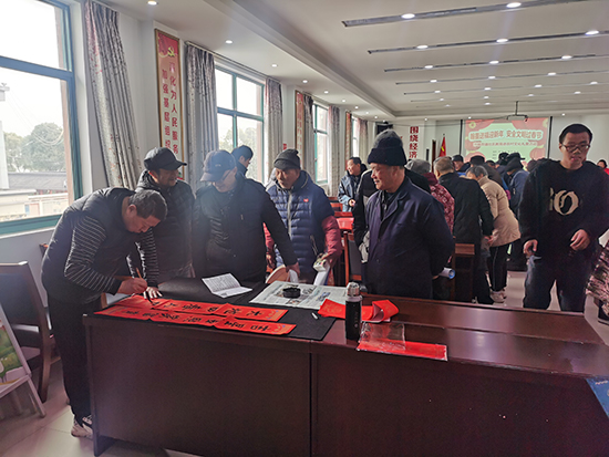 最后,孫端老年學校的顧關心老師帶領書法班學員現場潑墨揮毫,開展送福送春聯活動。“顧老師,給我寫一副哈!”“顧老師,能不能給我寫兩副,我要給我小兒子也帶一副去。”村民朋友們將幾位寫春聯的師生圍得嚴嚴實實,爭相索要一副副帶著墨香、“新鮮出爐”的春聯。“這個手寫的對聯好!買來的不如這個好。”“這個字寫得多漂亮!有文化的人寫出來的字就是不一樣!”一聲聲由衷的贊嘆聲將活動現場的氣氛推向了高潮。