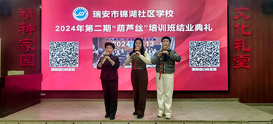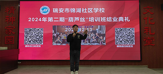 12 月 13 日晚,瑞安市錦湖社區(qū)學(xué)校文化禮堂內(nèi)華燈璀璨,一場洋溢著民族風(fēng)情與藝術(shù)魅力的葫蘆絲演奏會在此精彩上演,為觀眾帶來了一場難忘的音樂盛宴。此次演奏會作為第二期葫蘆絲培訓(xùn)班的結(jié)業(yè)演出,不僅是學(xué)員們學(xué)習(xí)成果的集中展示,更是他們在葫蘆絲藝術(shù)之路上的一次重要里程碑。