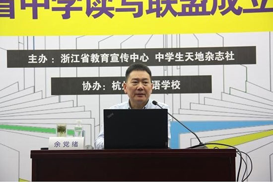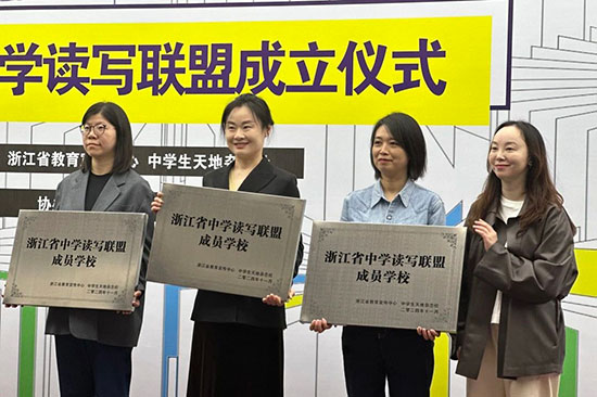 成立儀式上,副校長朱曉慧作為學校代表領取“浙江省中學讀寫聯盟成員學校”銅牌,學生處處長楊育萍領取浙江省中學讀寫聯盟頒發的指導師聘書。