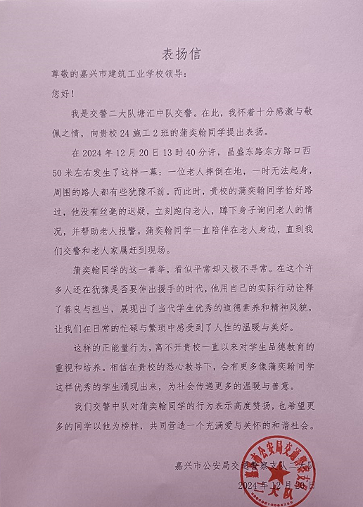 交警二大隊塘匯中隊的交警目睹了這一切,專程向學校送來表揚信,以此表揚蒲奕翰助人為樂的事跡,也激勵更多同學以他為榜樣,在別人需要的時候能主動伸出援助之手。