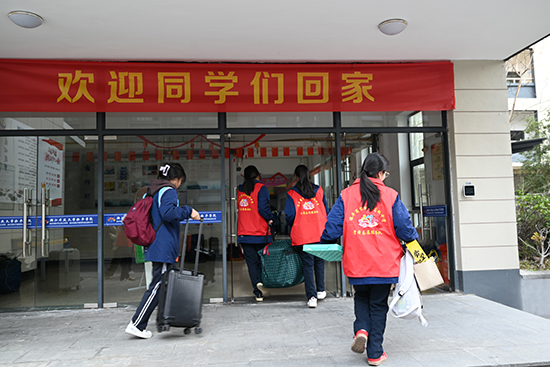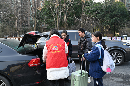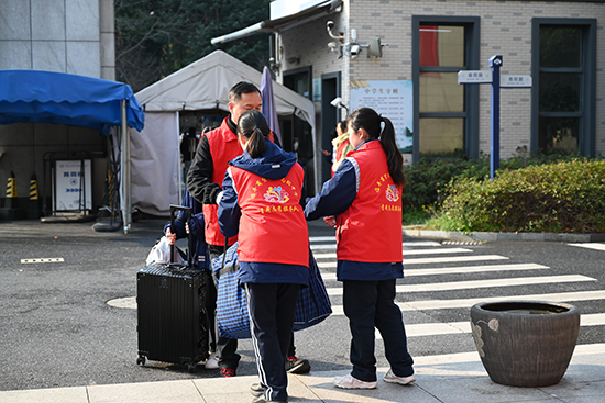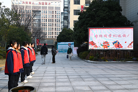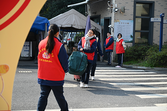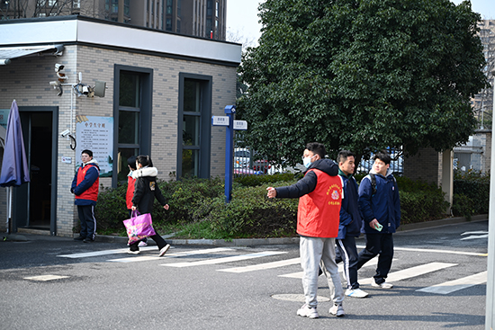 師生志愿者在各自崗位為家長們、同學(xué)們熱情服務(wù),“紅馬甲”成了校園一道亮麗的風(fēng)景線。
