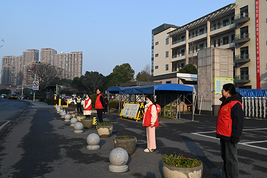 晨光熹微,青荷志愿隊(duì)、教師、保安、交警各司其職,維持車輛秩序,確保每一位學(xué)生安全入校。