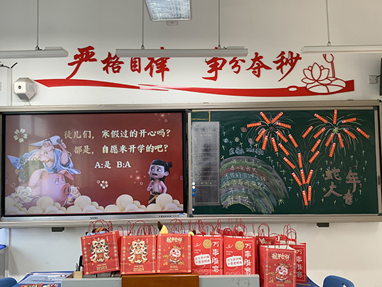 走進(jìn)教室,氛圍愈發(fā)濃厚,班主任們精心布置,儀式感滿滿。紅包里藏著老師精心準(zhǔn)備的寄語,激勵同學(xué)們在新的一年勇敢前行;一顆顆甜蜜的棒棒糖,象征著同學(xué)們對未來生活的美好憧憬;“旺仔牛奶”承載著老師對同學(xué)們新學(xué)年身體強(qiáng)壯、學(xué)業(yè)進(jìn)步的美好期許。