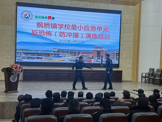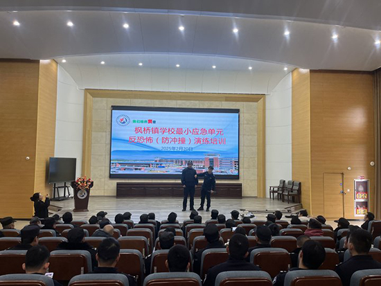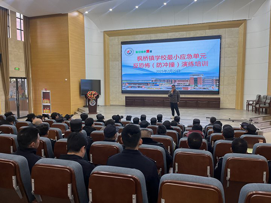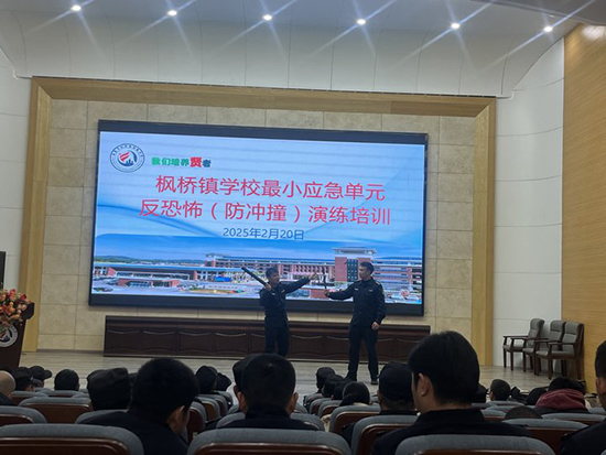 2月20日下午,諸暨市楓橋鎮(zhèn)初級(jí)中學(xué)的報(bào)告廳內(nèi)陸續(xù)走來(lái)穿保安制服的人員,原來(lái)這里要舉行楓橋鎮(zhèn)中小學(xué)、幼兒園安保人員“最小應(yīng)急單元反恐怖(防沖撞)演練”培訓(xùn)。