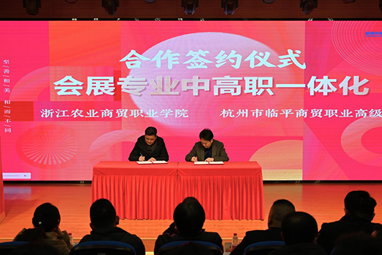杭州市臨平商貿(mào)職業(yè)高級中學(xué)集團理事長、校長沈琪與浙江農(nóng)業(yè)商貿(mào)職業(yè)技術(shù)學(xué)院黨委委員、創(chuàng)意設(shè)計學(xué)院院長呂玉龍簽訂會展專業(yè)中高職一體化五年制人才培養(yǎng)協(xié)議,搭建人才培養(yǎng)“立交橋”。