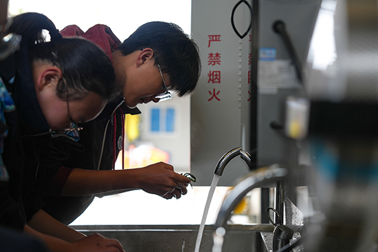 采挖結(jié)束,同學(xué)們手捧滿是泥土的薺菜,來到后廚分揀、清洗,制作品嘗寧波傳統(tǒng)菜肴薺菜炒年糕。從田間到餐桌,不到1個(gè)小時(shí),新鮮透骨的薺菜年糕讓同學(xué)們直呼吃得過癮。有細(xì)心的同學(xué)發(fā)現(xiàn):燒熟的薺菜仿佛變身了,從原本的暗沉無光變得青翠欲滴。