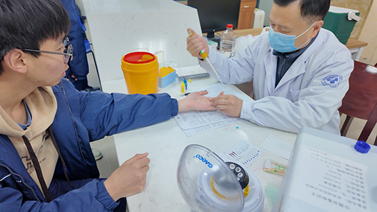 上午八時,區中心血庫采血車周圍師生陸續聚集,獻血師生們在學生志愿者的暖心引導,醫務人員的溫馨提醒下依次完成健康篩查、血液初檢等準備,陸續踏上采血車進行獻血。采血車里,徐老師剛剛結束獻血,醫生將400cc的血袋放入箱內,徐老師面帶微笑并鼓勵旁邊等候的同學:“適量獻血對身體無害,同學們放松一點。”手中的獻血證,密密麻麻的記錄,代表著職教中心教師們多年來參與生命接力義舉,滿18周歲的同學們也用自己的實際行動,奉獻著新的青春力量。9時30分,活動現場人聲鼎沸,達到高峰。