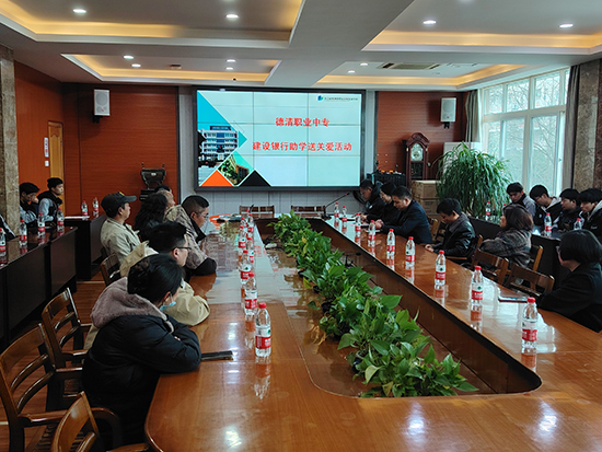 3月7日,建設銀行德清支行副行長王佳麗一行到訪德清職業中專,開展“助學送關愛”主題活動,為20名學子發放慰問物資并舉行座談。校政教處處長鄧志民、教務處副處長夏溢敏出席接待。