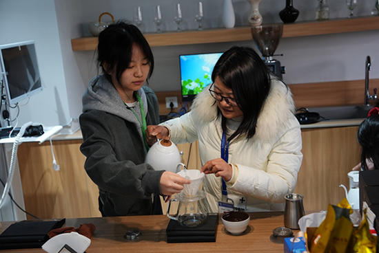 圖書館三樓的咖啡吧內,研磨咖啡豆的細碎聲與輕柔的音樂相映成趣。女教職工們或在咖啡師的指導下嘗試手沖技法,感受水溫與水流對風味的影響;或倚窗而坐,品味特調的“春日限定”拿鐵,搭配一份小甜點,享受難得的午后閑適。