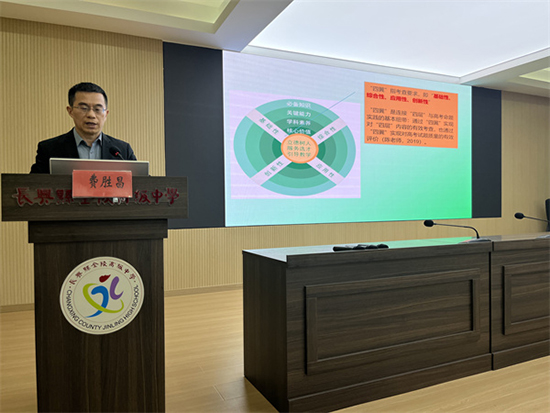正高級教師、省特級教師費勝昌老師就“新高考命題主要特點及趨勢”這一話題深入剖析。他從命題的依據、命題的邏輯、命題的原則及考查的基本能力等方面闡述了新高考背景下高中英語命題的思路和方法。同時,他要求老師們在課堂中要善于利用學生的錯誤轉化成課堂高效——看得見思維生長的課堂,為高三復習課轉型提出更高要求。