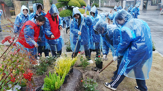 盡管天空下起陣雨,但絲毫沒有澆滅大家的熱情。師生們披上雨衣、挽起褲腳,繼續(xù)勞作。雨中,歡聲笑語與鐵鍬鏟土聲交織,奏響了一曲動(dòng)人的勞動(dòng)樂章。