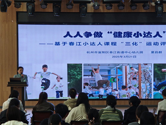 學(xué)員們來到了沉靜又美麗的杭州市富陽區(qū)春江街道中心幼兒園的中心園區(qū)和建設(shè)園區(qū),進(jìn)行了現(xiàn)場觀摩全園混齡“春江小達(dá)人”運(yùn)動(dòng)大循環(huán)活動(dòng)。園長夏邑群以《人人爭做“健康小達(dá)人”——基于春江小達(dá)人課程“三化”運(yùn)動(dòng)評價(jià)的實(shí)施》為題,向?qū)W員們介紹了“三化”評價(jià)體系,借助云端數(shù)據(jù)動(dòng)態(tài)追蹤兒童成長軌跡,從而打造野趣盎然的體能循環(huán)系統(tǒng)。