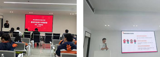 各組學生代表依次登臺,向評審團詳細闡述設計理念、面料選擇及制作工藝,并展示精心制作的效果圖集。