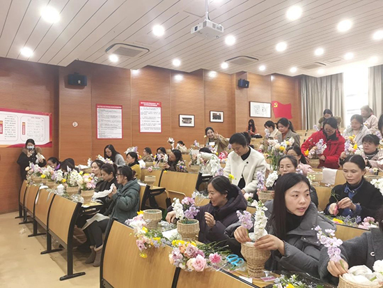 上午9時,“甜筒花語”創(chuàng)意花藝活動吸引女性教職工參與。活動現(xiàn)場陳列藤編制作的甜筒形花器,搭配玫瑰、紫羅蘭、洋牡丹等十余種春季花材。花藝師現(xiàn)場演示了甜筒花籃的制作技巧,強調(diào)“以自然弧度體現(xiàn)春日的流動感”。參與教師們發(fā)揮巧思,一個個精美的作品誕生了。一簇簇鮮花將生機勃勃地綻放在教案旁、鍵盤邊,恰似把春天的詩行悄悄寫進了校園。