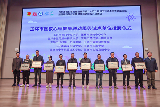 之后,玉環(huán)市教育局黨委委員李旦福、玉環(huán)市衛(wèi)生健康局副局長張鵬為玉環(huán)市中等職業(yè)技術(shù)學(xué)校、玉環(huán)市楚門中心小學(xué)、玉環(huán)市陳嶼中心小學(xué)等10家試點(diǎn)學(xué)校授牌,激勵這些學(xué)校積極探索青少年心理健康教育的新路徑、新方法。