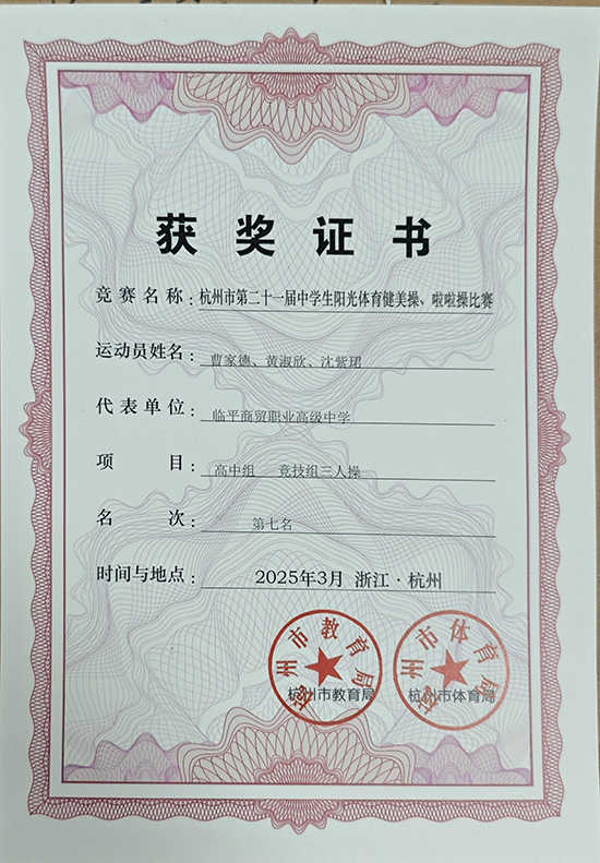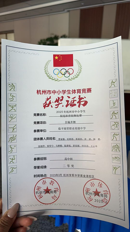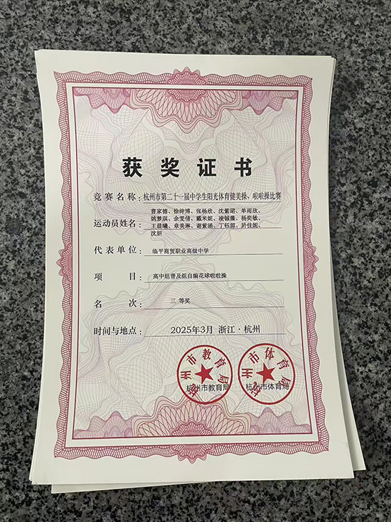 在剛剛落幕的杭州市中小學生街舞比賽,杭州市中小學生健美操、啦啦操比賽中,臨平商貿職業高級中學校健美操隊一路過關斬將,取得了非常優異的成績!街舞組勇奪二等獎,競技三人操第七名,花球啦啦操三等獎——三面戰旗,書寫的是團隊拼搏的熱血故事,更是教練與隊員們用智慧與汗水澆筑的青春勛章!